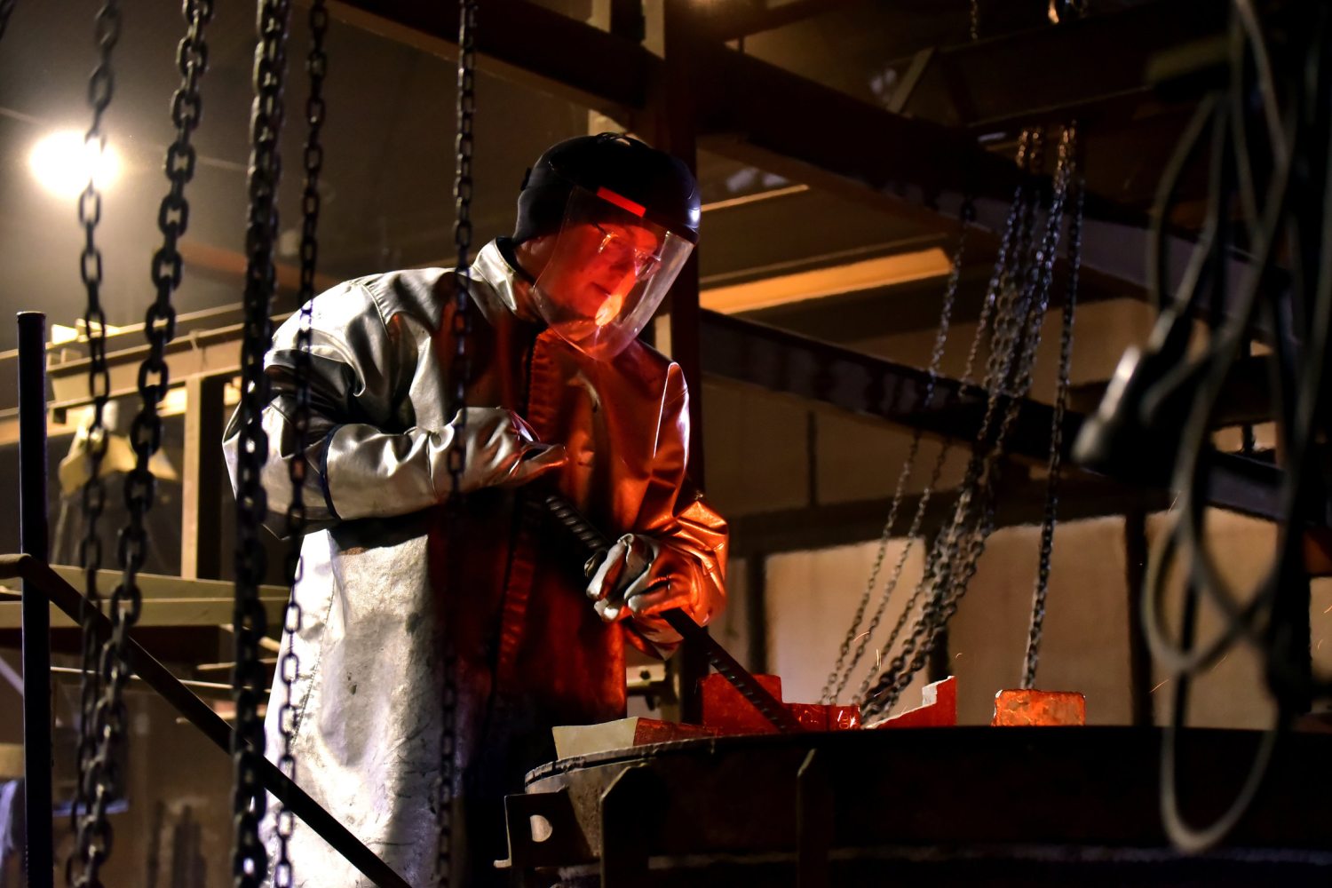 Minden alkalommal izzik a vasrúd vége, ahogy kihúzza a fortyogó fémből.
