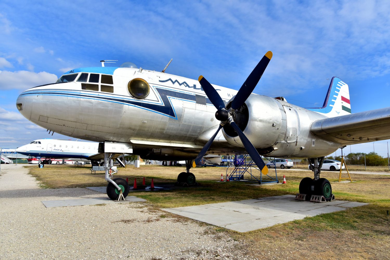 Az ötvenes évekből a Kádár-korba ugrunk, előbb az Il-14, majd a még sikeresebb Il-18 (tervezője Szergej Vlagyimirovics Iljusin) típussal repült a magyar légiközlekedési cég, utóbbi olyan sikeres volt, hogy 1960-tól egészen 1987-ig alkalmazták. Egy példánya a bejárathoz közel parkol, megjelenése elegáns, jelentőségteljes.