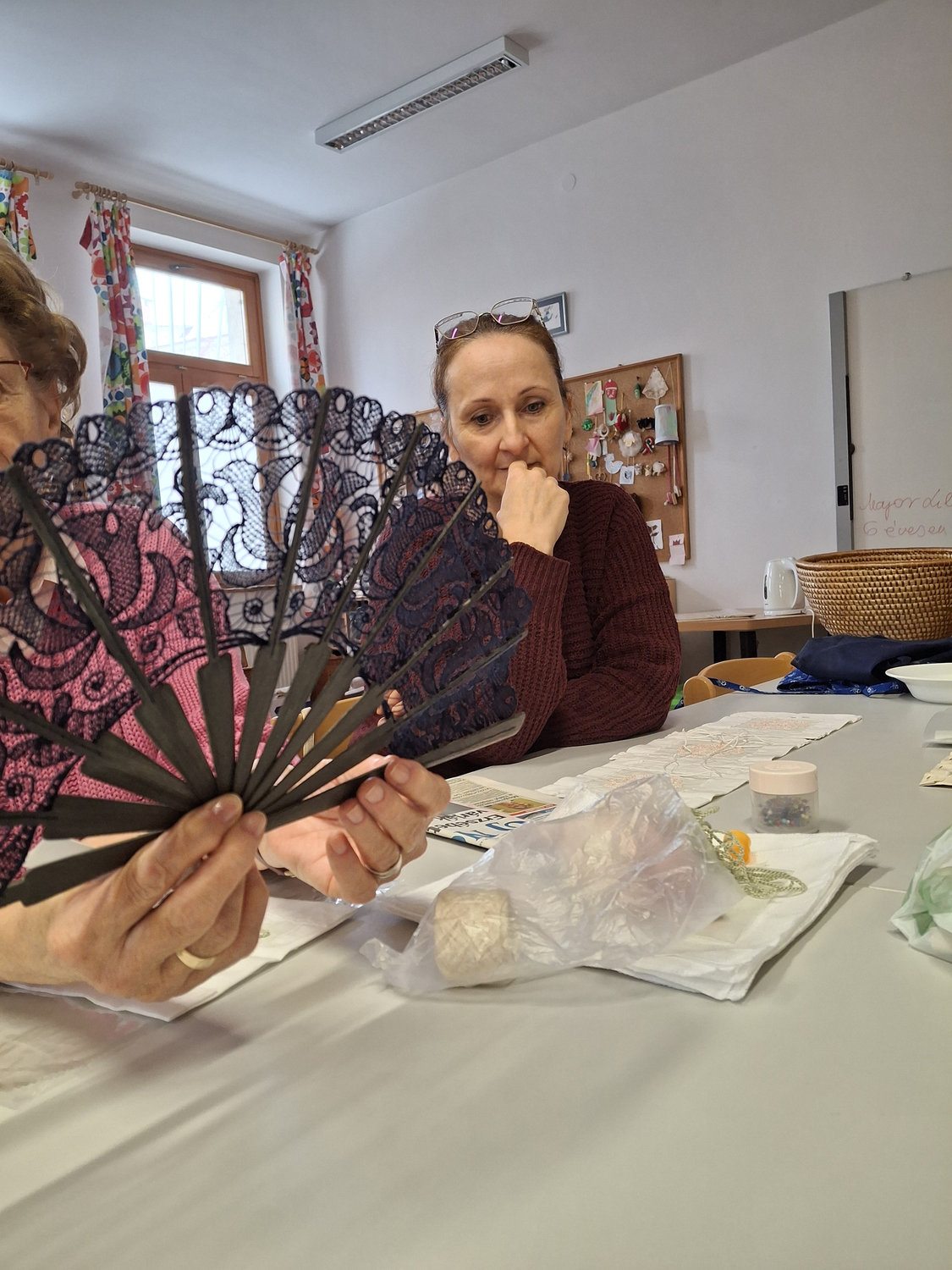 Az asztalnál helyet foglal egy Debrecenben tanuló, külföldi fizikus hallgató is. Ő is a Facebookon talált rá a szakkörre. A magyar kultúrát már több oldalról felfedezte, most a csipkén keresztül kapcsolódik hozzá. A minták szerkezetét figyeli: a rendszert, az ismétlődést, a belső logikát.