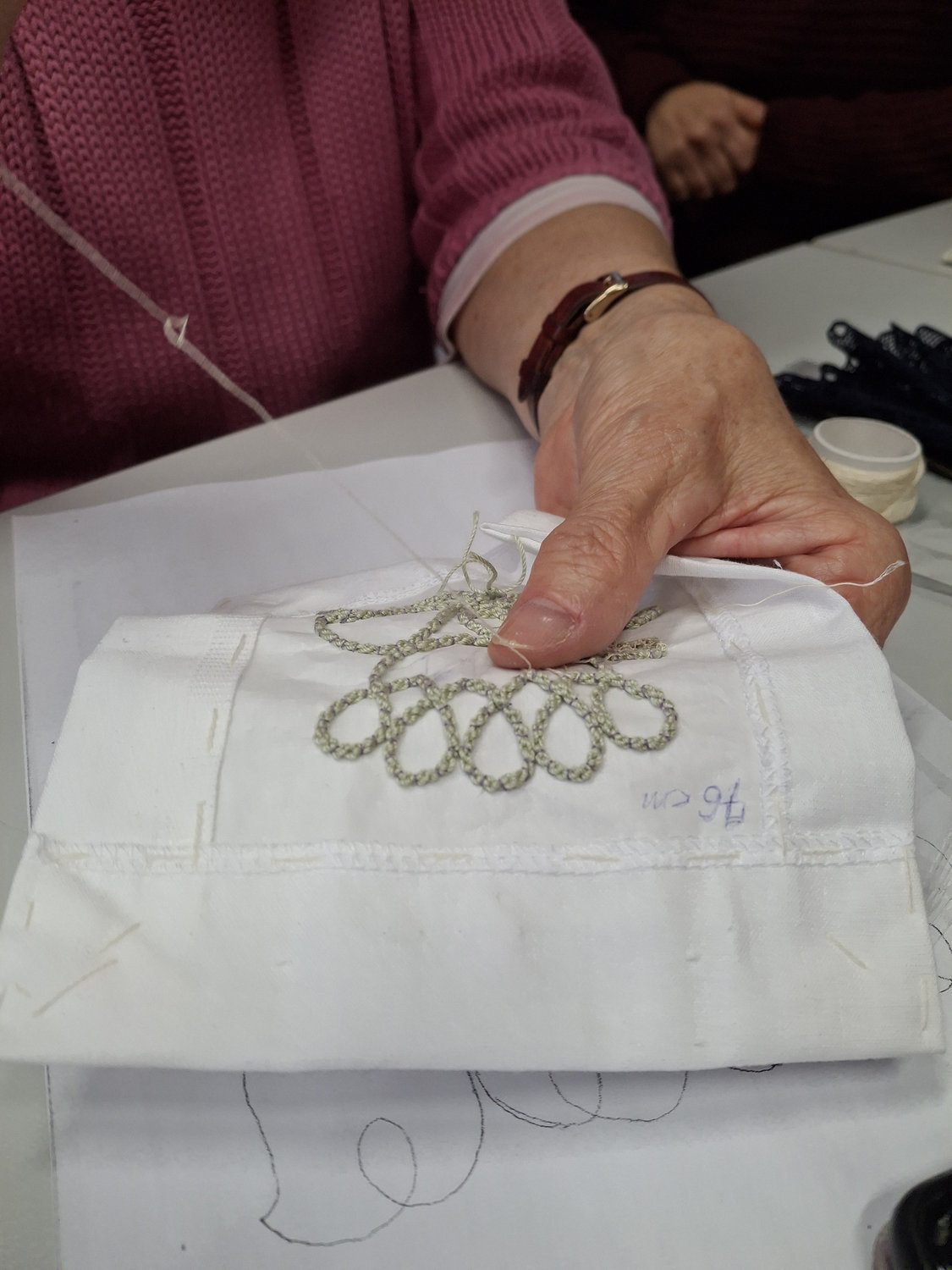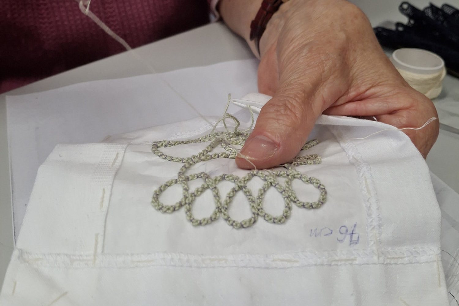 A szolnoki csipke nem ad gyors sikerélményt. Az első lépés a zsinór elkészítése – és ez korántsem mellékes. Ha nem pontos, a minta elcsúszik. A kitöltő öltések ismerősek lehetnek más varrott csipkékből, de itt a szerkezet másképp épül fel. A szolnoki csipke karaktere a zsinór és az öltések finom játékában, egymásra hatásában rejlik.