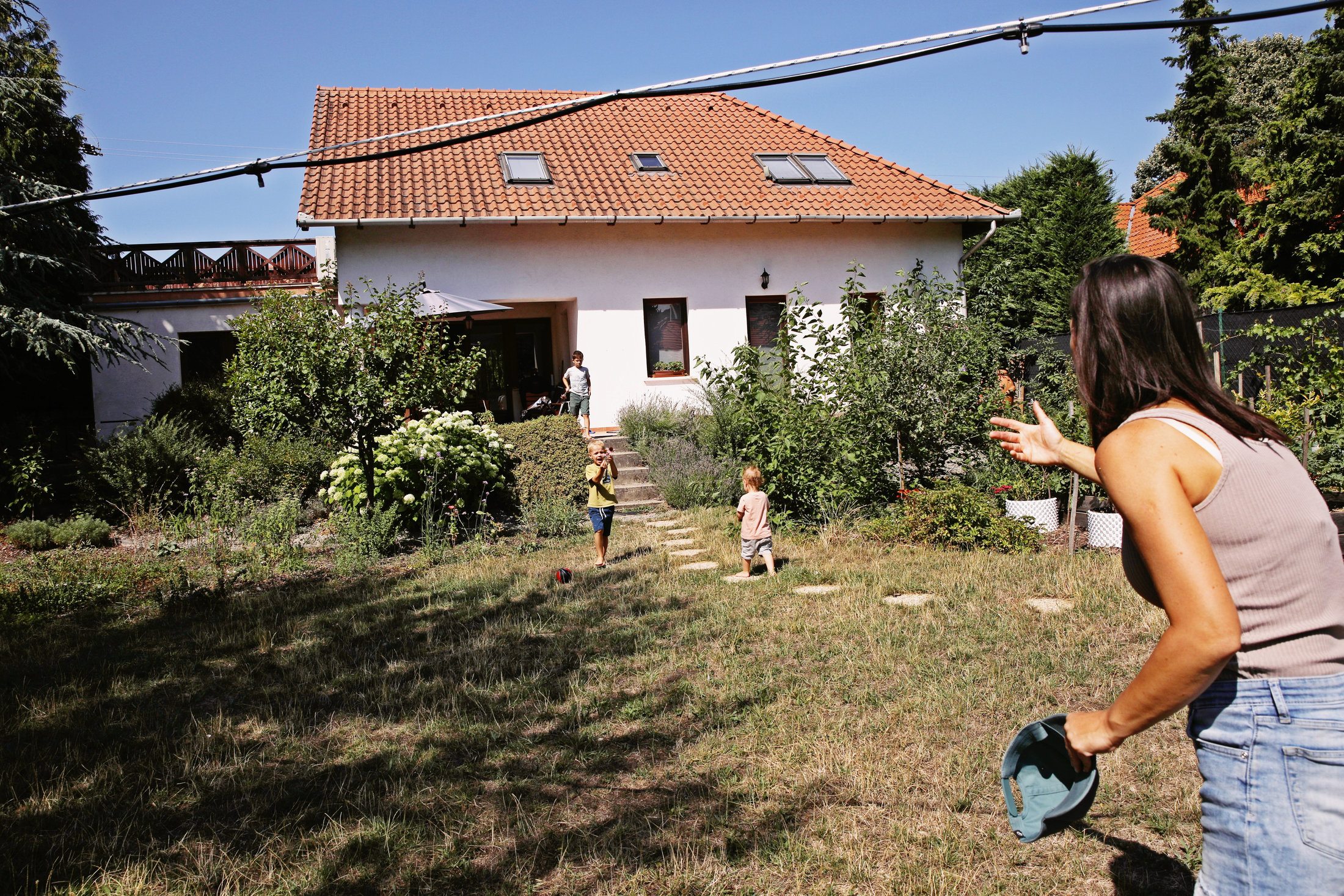 Délben érkezem. Nem szeretnék alkalmatlankodni ebédidőben, de a legidősebb gyerek, a nyolcéves Barni megnyugtat, hogy „csak fél kettő körül szoktak ebédelni, és ma amúgy is pizzát sütött anya, szóval pont jókor érkeztem”. Az ötéves Misitől rögtön megtudom, hogy „összerogyott a keze és átfordult egy korláton”, úgy szerezte a homlokán éktelenkedő zöld foltot. A kétéves Illés eközben körbebicajozza lábbal hajtós kétkerekűjével a teraszt, és pontosan tudja, hol kell lassítania, mielőtt lebukfencezne a levendulával, istenfájával, cickafark­kal tarkított oázisba. Mindannyian mezítláb, szabadon. Elfogy a pizza, és a két nagyobb bicajra pattan, már várja őket az unokatesó két utcával odébb. Miközben Illés megpihen édesanyja mellén, elkezdhetünk beszélgetni egy álom megvalósulásáról.