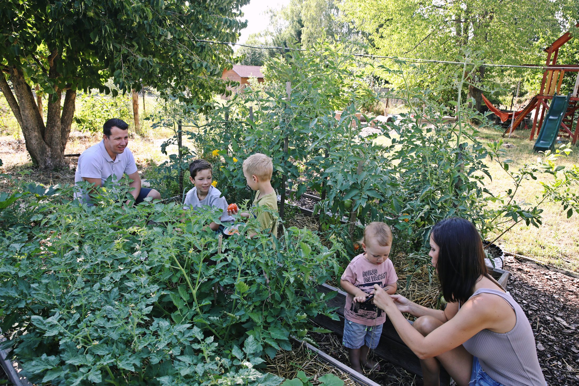 A permakultúra etikai alapelveit is figyelembe vesszük: gondoskodás a Földről, gondoskodás az emberekről, és a felesleg tisztességes elosztása. Arra törekszünk, hogy a kertünk a családot tavasztól őszig folyamatosan ellássa zöldségekkel és gyümölcsökkel, de igyekszünk a termés egyharmadát fent hagyni, hogy a madaraknak is jusson, és a sün is tudjon mit enni. Nagy álmom, a gyerekek játszóterének helyén úgy hét-nyolc év múlva kialakítani egy tavat, azzal lesz teljes az ökoszisztéma. És a tyúkólról sem szeretnék lemondani…”