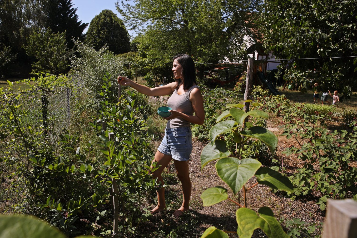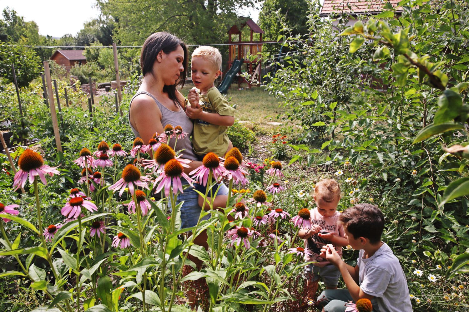 Olyan óvodát kerestünk, amely előtérbe helyezi a természetet, támogatja az otthoni életet, a fára mászást, a mezítláb futkosást, a szabad létet a természetes környezetben. S bár egy másik vármegyéig vezetett az út, az akkoriban kapuit nyitogató mányi tanyaóvoda kitűnő választásnak bizonyult. Nagyon tetszett az organikus pedagógia, amit felvázoltak, és ott találkoztam először az erdőkerttel. Márciusban elkezdenek virágozni a fák, a gyümölcsöt adó bokrok, egészen késő őszig termés van az udvaron, a gyerekek meg csak csipegetnek, innen is, onnan is” – mondja Bori, majd beszalad a házba, hogy feltöltse a friss mentával és citrommal megpakolt kancsót némi hideg vízzel.